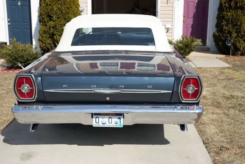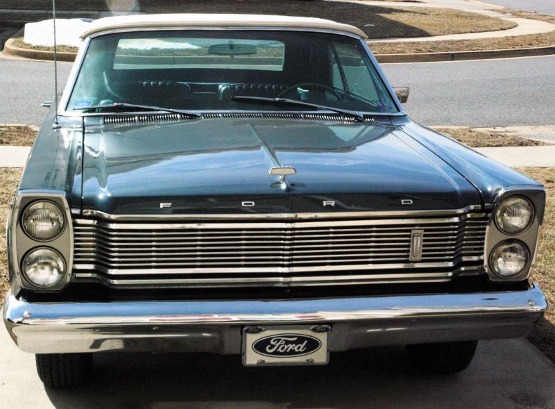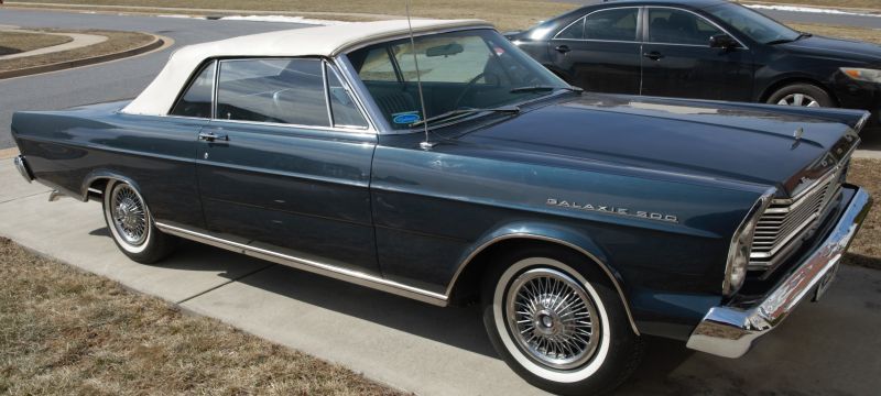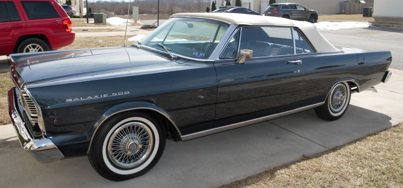 In fall of 2015 found this 1965 Galaxie 500 Convertible with a 289 c4 cruisomatic. A prior owner had it painted Caspian Blue which is a T-Bird color from 1965 but it is coded a Y Silver Blue with two tone blue interior and white top. Built in Mahwah, New Jersey on April 27, 1965. Had to have the engine rebuilt and added dual exhaust. Good news is, it runs smooth as glass and sounds great now. Just waiting for it to warm up.