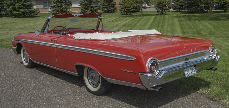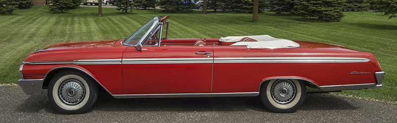This '62 Galaxie Sunliner is the first classic car I have owned. I have been pestering my husband, Don, for years about getting a classic car. I was never totally serious so It never happened. I decided to purchase a convertible for a fun car. As we were looking at used modern cars we came across a few classic cars in the same price range. As we were looking at cars Don, a Ford guy, kept saying that he worked on that car when he was a kid. He liked the idea of being able to get his hands greasy again. We realized this was a possibility. We were excited as a couple of kids at Christmas. After looking around we found our car, Thelma, at Ellingson Motors in Rogers, MN. They were great! As rookie owners we wanted a turn key car and they were great about steering us away from cars with issues. So now we wait for spring to start showing off Thelma.